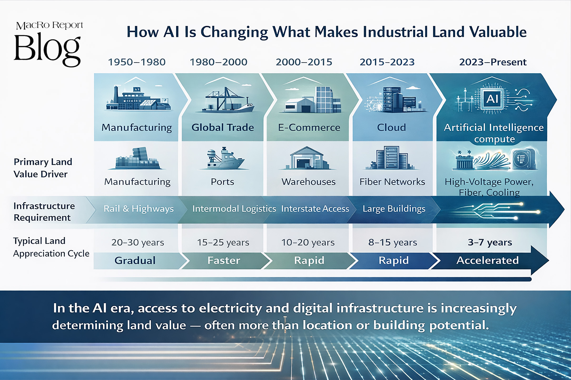 In this the 13th MacRo AI Series and follow-up to Part 1 on how AI is reshaping land values, we examine how power — not location — is becoming the primary driver of industrial land value, forcing a rethink of traditional real estate valuation models in the AI era.